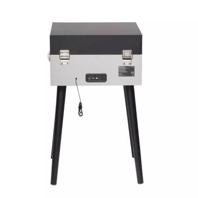 • Freistehender Plattenspieler, eingebauter Verstärker; Retro-Look mit Kofferdesign und schwarzen Beinen