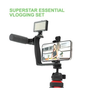 Das 5-teilige Vlogging Kit ‚Superstar‘ eignet sich ideal für Fotos, Videos, Selfies und Live-Streaming. Das Videolicht mit 50 LEDs hat 3 einstellbare Beleuchtungsmodi und kommt mit 3 verschiedenen Farbfiltern (blau, rot, weiß) für kreative Aufnahmen. Das Shotgun-Mikrofon mit Nierencharakteristik ermöglicht einen großzügigen Aufnahmebereich mit ausreichender Geräuschunterdrückung. Das praktische Mini-Stativ kommt mit einer abnehmbaren Bluetooth-Fernbedienung mit bis zu 10m Reichweite. Die zusätzliche L-Halterung mit Blitzschuh-Adaptern ermöglicht es, dein Smartphone, das LED-Videolicht und/oder das Mikrofon zu befestigen. Lieferumfang: Smartphone-Halterung, universelles Mikrofon, LED-Videolicht mit Beleuchtungsmodi, L-Halterung mit Blitzschuh-Adaptern, Mini-Stativ mit abnehmbarer Bluetooth-Fernbedienung