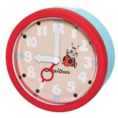 Wecker mit kinderleichter Bedienung, Gehäuse mit einer weichen sogenannten Rubbertouch-Oberfläche, hellblau/rot, Piepton-Wecksignal, obenliegende Abstelltaste, cremefarbenes Zifferblatt mit Marienkäfer-Motiv, weiße Ziffern und Zeiger, roter Weckzeiger, Größe 90 x 48 mm, benötigt 1 Batterie AA (nicht im Lieferumfang enthalten)