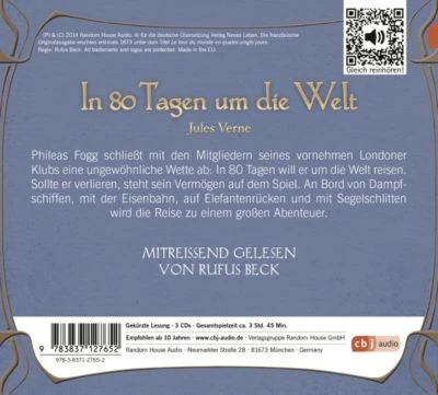 Phileas Fogg schließt mit den Mitgliedern seines vornehmen Londoner Klubs eine ungewöhnliche Wette ab: In 80 Tagen will er um die Welt reisen. Sollte er verlieren, steht sein Vermögen auf dem Spiel. An Bord von Dampfschiffen, mit der Eisenbahn, auf Elefantenrücken und mit Segelschlitten wird die Reise zu einem großen Abenteuer.(3 CDs, Laufzeit: 3h 45)Jules Verne, geb. 1828 in Nantes, studierte Jura, schrieb aber bereits Theaterstücke und Erzählungen. Sein erster Erfolgsroman ‚Fünf Wochen im Ballon‘ erschien 1863. Seine großen Romane waren von Anfang an Bestseller. Als neuer Mythenmeister und Klassiker ist er der Begründer der modernen Science-fiction-Literatur. Jules Verne starb 1905 in Amiens.Rufus Beck, Jahrgang 1957, studierte an der Universität Heidelberg Islamistik, Philosophie und Ethnologie, ehe er sich dem Schauspielfach zuwandte. Nach Bühnenauftritten in Heidelberg, Saarbrücken, Tübingen, Schauspiel Frankfurt, Schauspiel Köln und Basel ging er von 1988 bis 1995 ans Bayerische Staatsschauspiel in München, dem er heute noch als Gast verbunden ist. 1990 wurde er für die Rolle des Franz Moor in Schillers „Die Räuber“ zum Nachwuchsschausspieler des Jahres gewählt.Rufus Beck ist als Hörbuchsprecher vor allem durch Harry Potter populär geworden. Für die Interpretation hat er vier Goldene und vier Platin Schallplatten sowie 2008 den HÖRkulino im Rahmen des Deutschen Hörbuchpreises bekommen. Er ist bis heute einer der beliebtesten Hörbuchsprecher überhaupt.