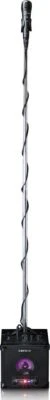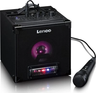 Dieses kompaktes Karaoke-System mit Bluetooth-Lautsprecher aus dem Hause Lenco verfügt über eine LED-Lichtanimation mit verschiedenen Farben und ein Mikrofon inklusive Mikrofon-Ständer. Der Lautsprecher ist mit je einem AUX-, einem Micro-SD- und einem USB-Eingang ausgestattet Das Mikrofon hat Lautstärke- und Echoregler sowie ein Kabel. Der dazugehörige Ständer lässt sich abnehmen. Bei voll aufgeladenem Akku liegt die maximale Nutzungsdauer bei etwa 10 Stunden.
