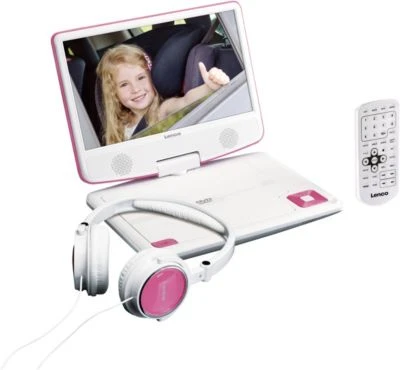 Der Lenco DVP-910 ist ein kompakter DVD-Spieler mit einem 9-Zoll-Bildschirm, welcher um 180° gedreht und gekippt werden kann. Er wird mit Fernbedienung, Kopfhörer, Kopfstützenbefestigung, 12 Volt Adapter und passendem Netzkabel ausgeliefert.