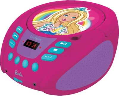 Tragbarer CD-Spieler für Kinder im Barbie-Design mit Aux-Anschluss zur Wiedergabe externer Geräte wie Handy oder MP3-Player.