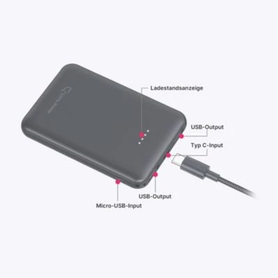 Vier LED´s halten Sie dabei immer über den Ladestatus Ihrer Powerbank auf dem Laufenden. Wählen Sie zwischen den beiden Auflade-Möglichkeiten des Ersatzakkus: Laden Sie über das mitgelieferte USB- auf Typ C-Kabel über den USB-C Input, oder über den Micro-USB-Input (Micro-USB-Kabel nicht im Lieferumfang enthalten).