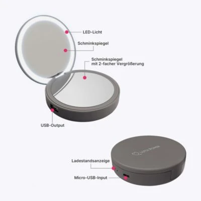 Schminkspiegel und mobile Stromversorgung für unterwegs. Frisches Make-up und eine Portion Extra-Power gefällig? In diesem Kosmetikspiegel verstecken sich nicht nur Normalspiegel und 2-fach-Vergrößerungsspiegel, sondern auch ein Zusatzakku als Ladestation für unterwegs. Ein absolutes Muss in jeder Tasche! Die Lotta Power Powerbank nimmt keinen unnötigen Platz in der Handtasche weg. Im Gegenteil: sie spart sogar Platz, weil sie nämlich mehrere Funktionen gleichzeitig erfüllt! Diese einzigartige Kombination wird Sie niemals im Stich lassen. Das eingebaute LED-Ringlicht sorgt für genügend Licht beim Schminken und der 4.000 mAh-Lithium-Akku für eine ausreichende Ladung Ihres Smartphones oder Tablets.