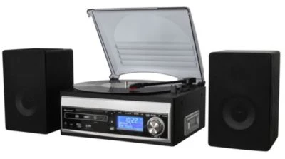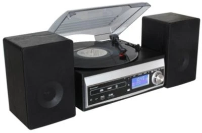 Der Plattenspieler mit Tonarmlift in der Gehäuseoberseite und das seitlich installierte Kassettenteil schließen die Lücke zwischen Neuzeit und der Nutzung jahrzehntelanger Tonträger-Technologien.Das HiFi-Gerät des Markenherstellers Soundmaster empfängt sowohl moderne DAB+ Sender als auch UKW Programme und ermöglicht das Abspeichern der eigenen Lieblingsprogramme auf Festsenderspeicher-Plätzen.Die ausgereifte Encoding-Funktion nimmt Musik- oder Sprachwiedergabe direkt von Platte/CD/Kassette und sogar Radio auf USB und SD Card auf. Der integrierte MP3-fähige CD Player mit ID3-Anzeige für Titel und Interpret ist individuell programmierbar.